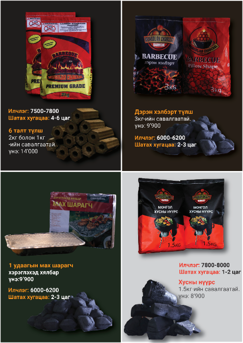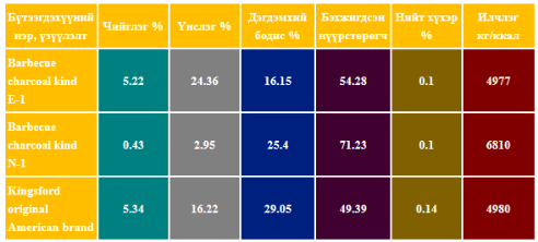 Манай үйлдвэрлэсэн Barbecue charcoal briquette нь АНУ-ын алдарт ‘Kingsford original’ брэнд бүтээгдэхүүнтэй адилхан үнэргүй /odorless/, хиншүү, тортоггүй /smokeless/, хоргүй /harmless/ үзүүлэлттэй бөгөөд лабораторын шинжилгээгээр илчлэг, чийгшил зэрэг зарим үзүүлэлтээрээ илүү байгаа нь батлагдсан.